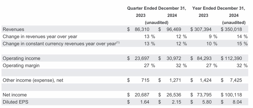Google Cloud achieved a 30% revenue growth year-over-year, reaching $12 billion for Q4, with operating margins improving to 17.5%.